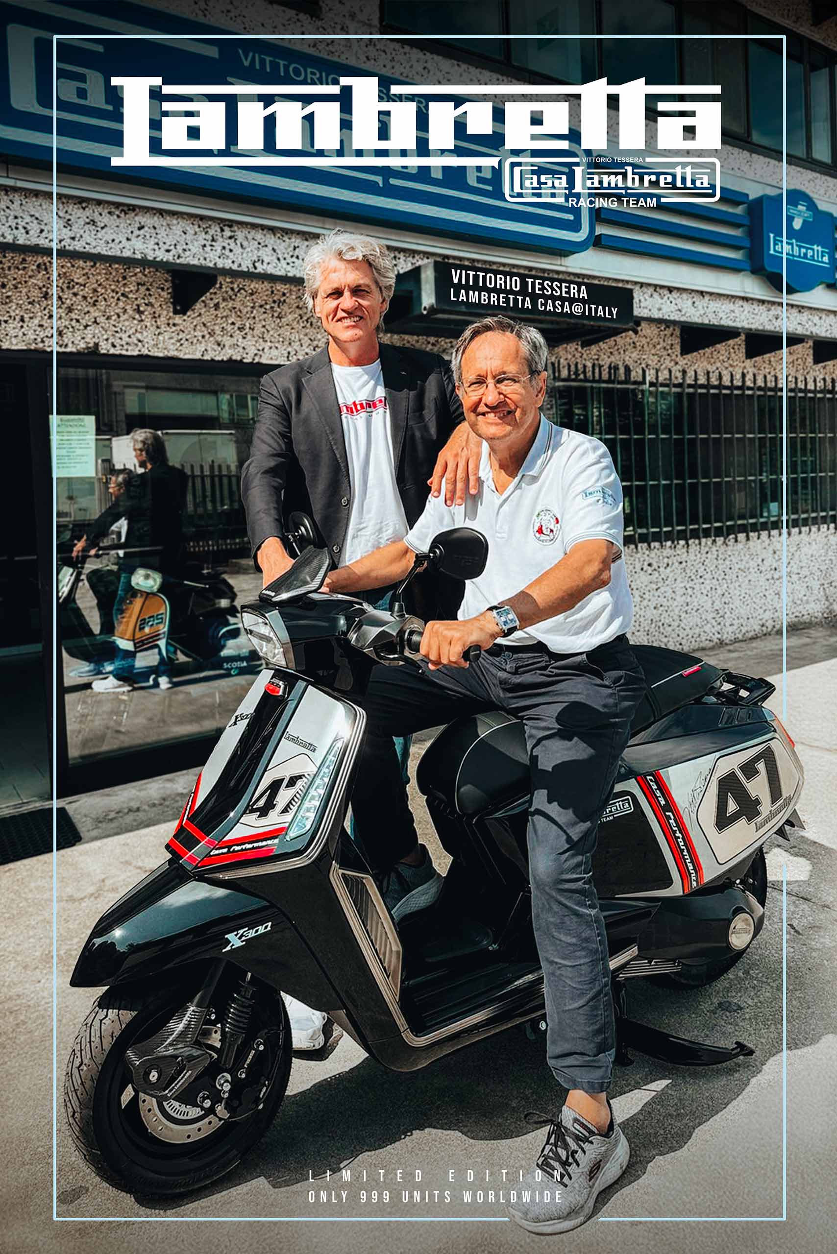 Casa Lambretta X300 số 001 ngay tại đây!Phiên bản giới hạn X300 Casa Limited Edition, chỉ 999 chiếc trên toàn thế giới.Bên cạnh Vittorio Tessera (Người sáng lập Casa Lambretta)và Walter Scheffrahn (Chủ sở hữu thương hiệu Lambretta).